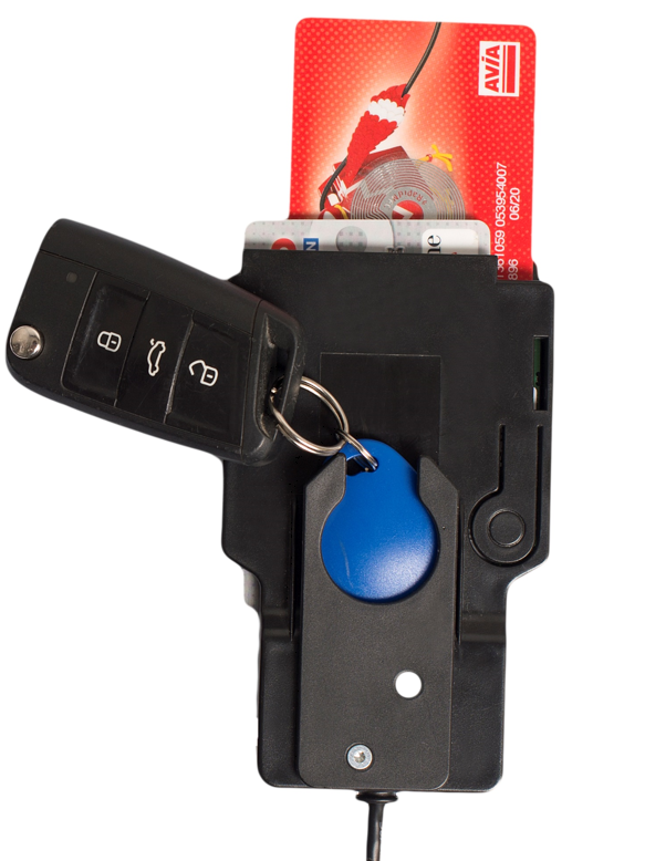 Fuel/parking/charging card monitoring The module monitors the use of the fuel/charging or parking cards and reports the status of the cards at the end of the journey to the administration software. For this purpose, RFID stickers are attached to the cards and read out by the device.